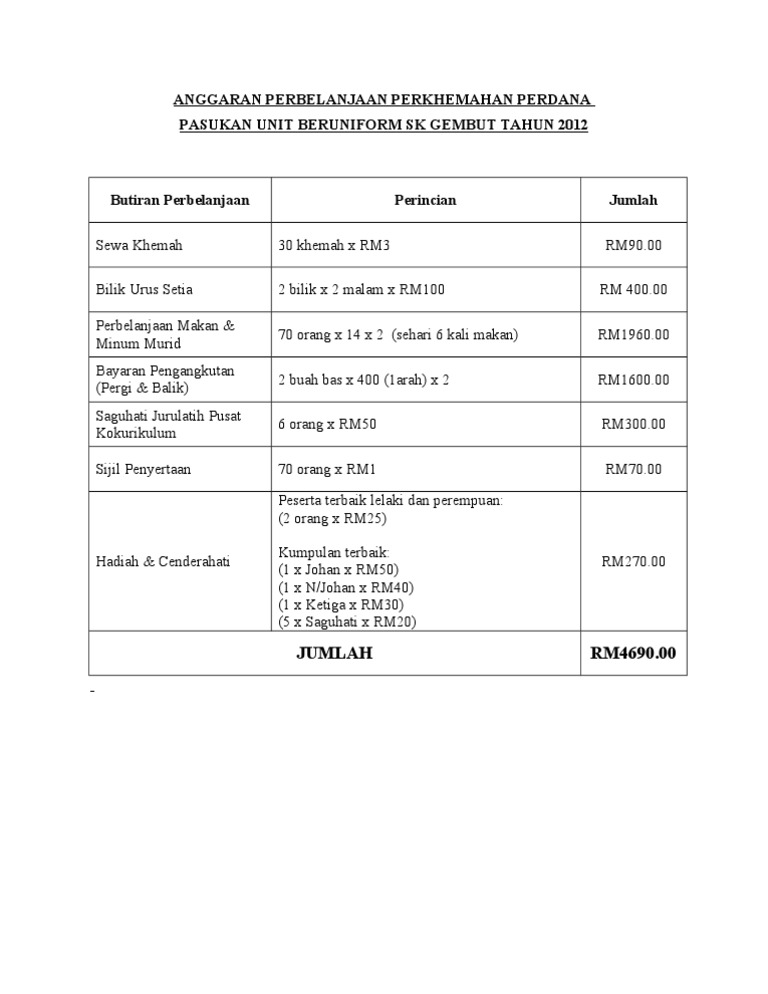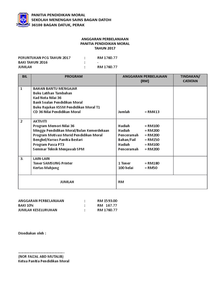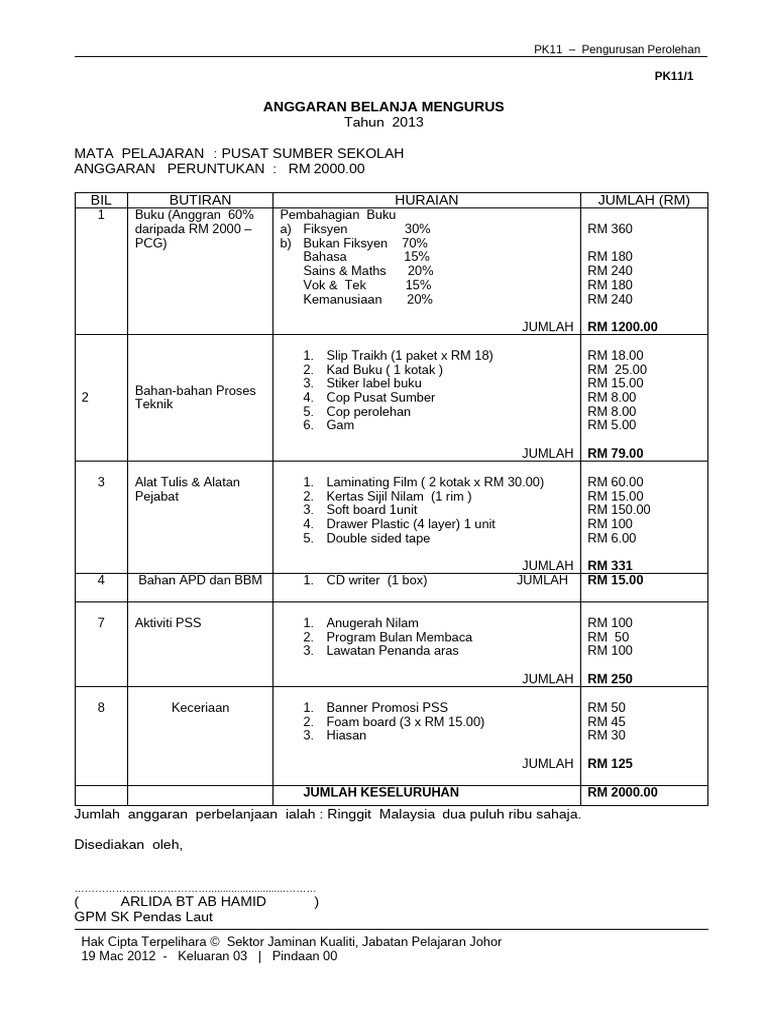 Program bacaan nilam6 anggaran 6.1 wang peruntukkan dapat 1. Bahan bantu pengajaran dan pembelajaran pembelajar an dan alatan buku rekod guru, ppm perin cian perbelanjaan peruntukan kewangan pr a s se e k ol o l a h u n t u k a k t i v i t i d a n p e rt rt a n d i n g an. Savesave anggaran perbelanjaan program 3k for later. Menganalisis perbelanjaan biasa dan cuba memasukkan dan perbelanjaan apa yang harus dikurangkan supaya tidak melampaui anggaran keluarga. Wujudkan sudut atau bilik pameran contoh.