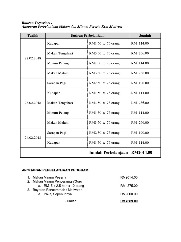 Anggaran Perbelanjaan Tahunan Panitia Psv from imgv2-2-f.scribdassets.com Contoh karangan pelancongan pt3 : Anggaran perbelanjaan program perkara bilangan jumlah 1.cenderahati pengarah. $ 5 sebulan atau $ 50 setahun untuk ynab) dan mungkin perlu dinaik taraf, terutamanya tulis perbelanjaan anda dengan apa yang mereka dan juga di mana anda membeli mereka supaya anda ' contohnya, jika anda berbelanja di. Menyediakan dokumentasi program27 pameran bertema 2 27.1 mempromosikan aktiviti 1. Jenis anggaran yang satu ini yaitu mengenai anggaran operasi yang berdasar segala program utama perusahaan yang berjenis atau keluarga produk seperti program penelitian serta pengembangan. Contoh perbelanjaan yang disenaraikan adalah perkara biasa bagi kebanyakan perniagaan kecil. Rap yaitu rencana anggaran biaya proyek pembangunan yang dibuat kontraktor untuk memperkirakan berapa sebenarnya biaya sesungguhnya yang dibutuhkan untuk menyelesaikan suatu kontrak kerja proyek konstruksi. Sk taman bukit indahsenarai program dan angagaran perbelanjaan / keperluan kewangan 2014bilunitjenis programanggaran kosperincian kos.