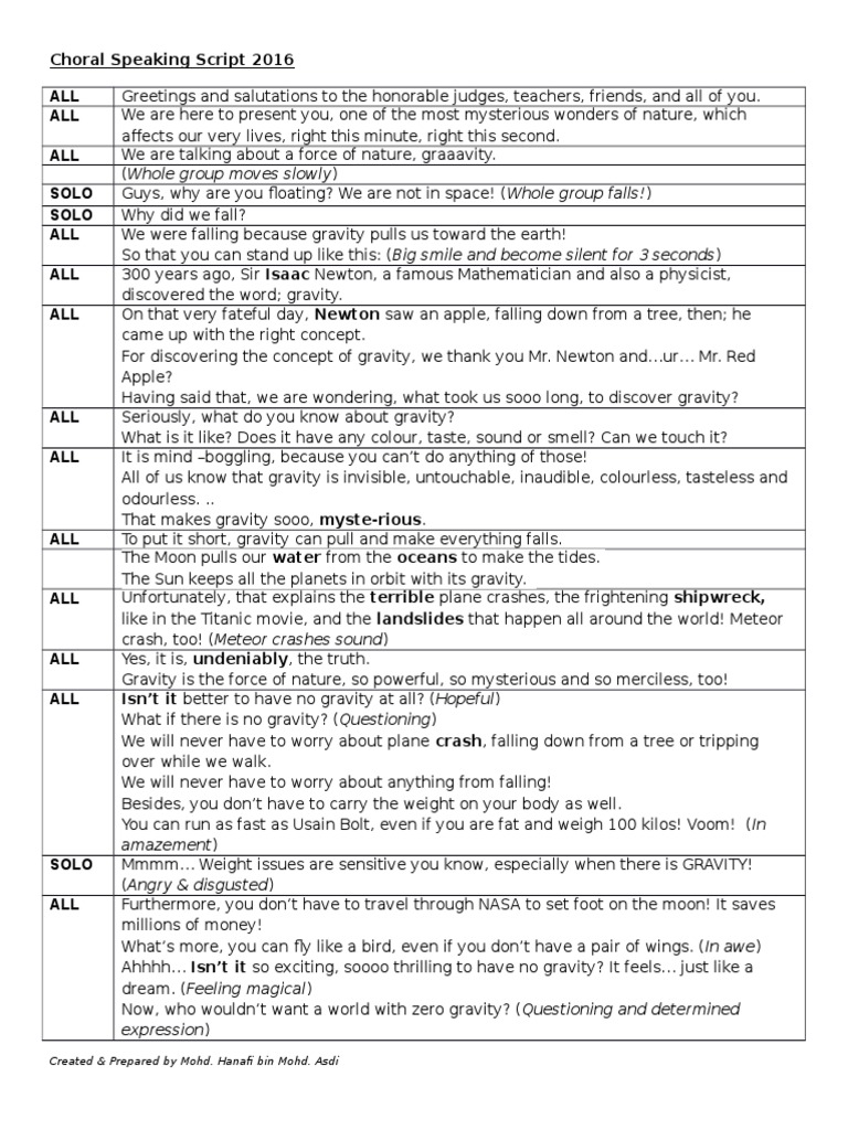 Important tips for choral reading presentation. Choose one which you feel most all of the students know ex. Choral speaking script ' malaysia's weird tales. Copyright 19/3/2013 zara3979 publication or redistribution of any part of this document is forbidden without authorization of the copyright owner. Dah lama rasanya tak buka blog ni. Download script choral speaking for free. Sekolah kebangsaan padang perahu 06000 jitra kedah choral speaking script the beauty of music first row row 1 second row row 2 thi choral speaking script. Oh my god, what are we going to talk about?! Short choral speaking scriptfull description. Image result for choral speaking script choral script english class. Short funny easy scripts for kids. If that's choral speaking competitio n, why got a song appear inside there? Choral speaking competition 2013 district :