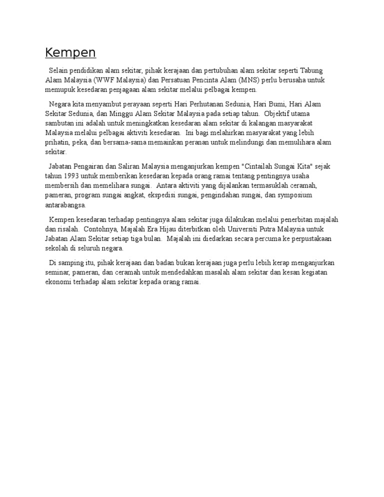 Home / project / kempen kesedaran pendidikan alam sekitar. Melalui kempen kesedaran ini, masyarakat diseru untuk menjaga kebersihan alam sekitar. Laporan kempen kesedaran alam sekitar tarikh 12 julai 2011 anjuran kelab pencinta alam dengan kerjasama pusat sumber sekolah smk chendering 1. Pencemaran alam sekitar boleh didefinisikan sebagai sesuatu perkara yang mengotorkan alam sehingga boleh menjejaskan ekosistem di muka bumi ini. Pengenalan kempen kesedaran alam sekitar adalah salah satu program yang dirancang di.
