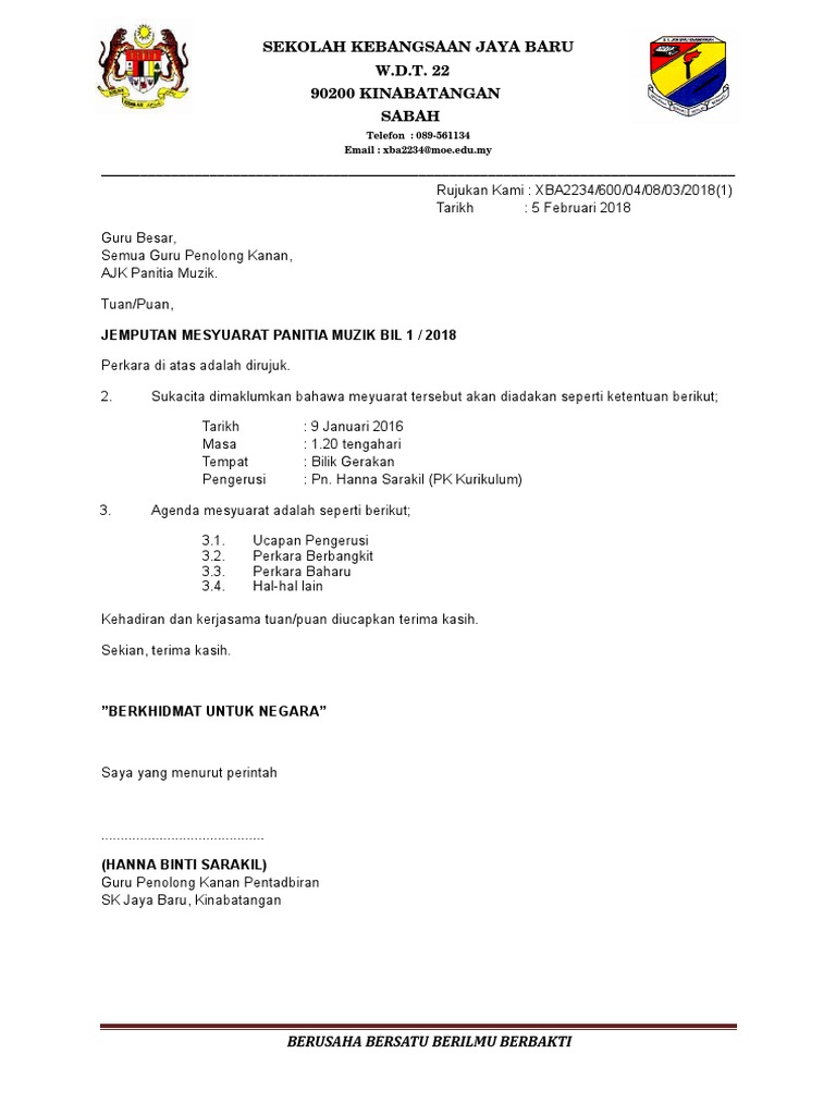 Jalan undan 8, taman perling, 81200 johor bahru, johor Agenda mesyuarat yang akan dibincangkan adalah seperti berikut; Saidah bt husin tuan, mesyuarat panitia muzik bil 1/(2020) perkara di atas adalah dirujuk. Surat panggilan mesyuarat panitia bm terkini. Contoh surat alih tiang elektrik tnb.